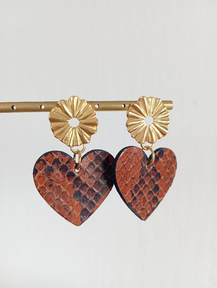 • Boucles d'oreilles faites main en cuir exotique ; serpent marron ou lézard noir.